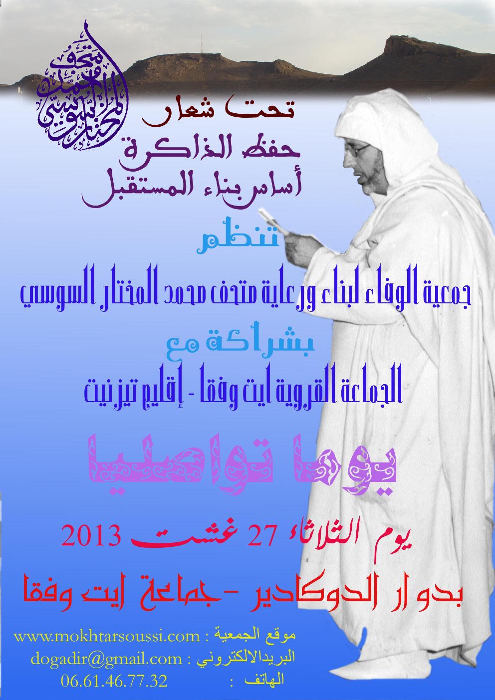 بشراكة مع الجماعة القروية أيت وفقا ، وفي إطار أنشطتها الثقافية ، تنظم جمعية الوفاء لبناء ورعاية متحف محمد المختار السوسي يوما تواصليا بدوار الدوكادير جماعة أيت وفقا ، يوم الثلاثاء 27 غشت 2013 ، تحت شعار : “حفظ الذاكرة أساس بناء المستقبل “