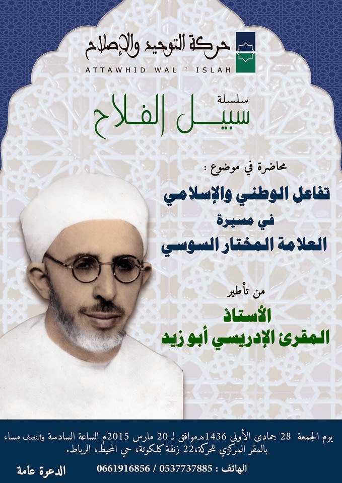 في إطار سلسلة محاضرات سبيل الفلاح للتوحيد والإصلاح هذا الموسم، والتي خصصتها للتعريف بأعلام ورموز المغرب، يستضيف المقر المركزي للحركة المحاضرة الثالثة للسلسلة بعنوان: “تفاعل الوطني والإسلامي في مسيرة العلامة المختار السوسي”.